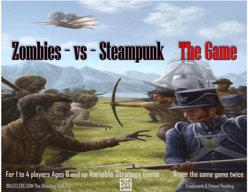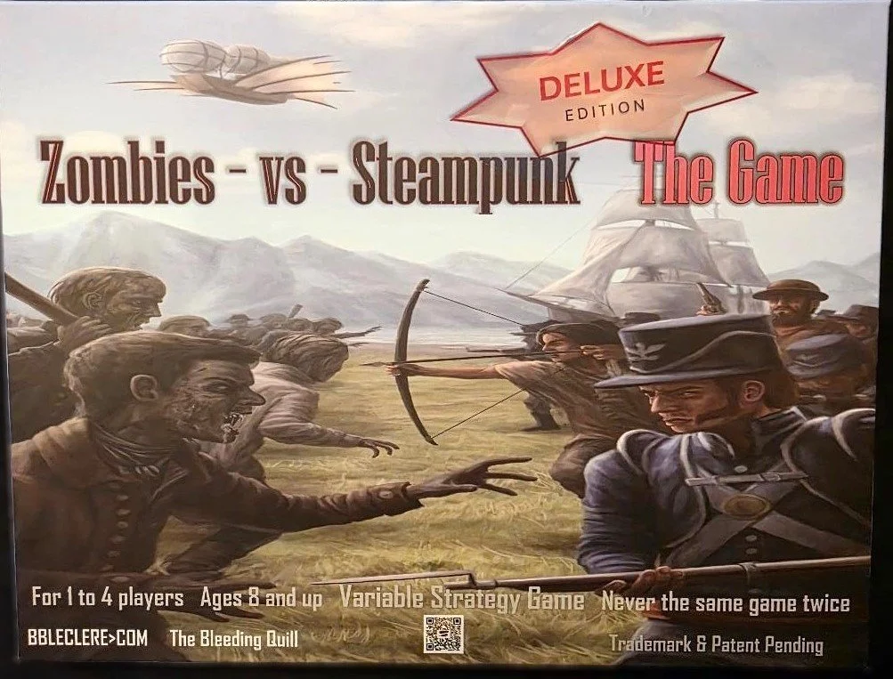 In addition to the first two books of the ZOMBIES v STEAMPUNK trilogy, The Secret War of 1834 and The Tainted Arrow, and our new Zombie vs Steampunk THE GAME (standard and deluxe editions), we offer an array of steampunk related items at our TRADING POST as well as some not so related D&D items and accessories. Take a moment to browse!